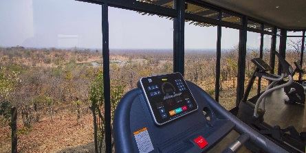 A fitness room has been built at Victoria Falls Safari Lodge in Zimbabwe, offering guests unrivalled views overlooking the bushveld, with the added opportunity to spot wildlife at the onsite waterhole during their workout.