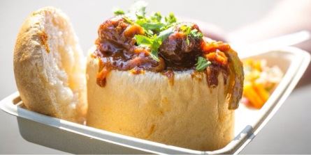 Bunny chow is made from a scooped-out loaf of fresh white bread, packed with Durban-style curry. Durban curries are made with a blend of up to 12 different spices and are particularly pungent and not shy on heat. The bread removed from the centre is used to dip into the gravy-soaked dish.