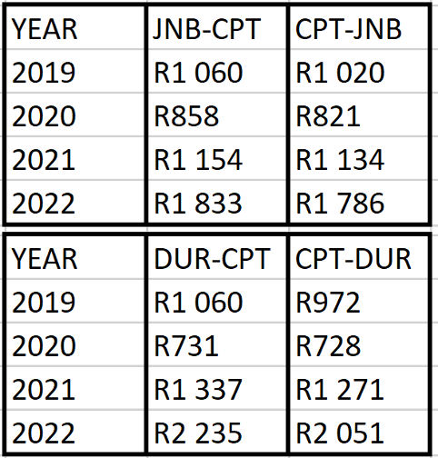 Taking an average of the prices (July 2019, July 2020, July 2021) of the most popular domestic routes in South Africa – JNB-CPT-JNB and DUR-CPT-DUR – Friel said it was clear that domestic fares had risen by 70%-111% by July 2022.