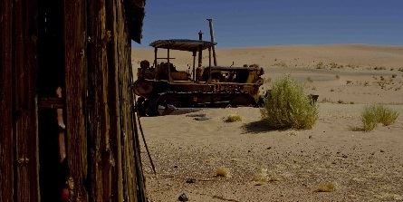 To reach his claims with food and mining supplies, Kahan had to make his way through shifting dunes with transport available in those years, which was indeed a hazardous undertaking. After World War II, Kahan bought some Ford ‘stopneus’ lorries from surplus war stock, fitting them with Dakota aircraft tyres. With these low-pressure aircraft tyres, he was able to bring supplies and equipment to Saddle Hill. However, one of these lorries, nicknamed Suzie, had unfortunately to be abandoned in the dunes, and today still awaits the return of a repair crew. Likewise a bulldozer, which was pulling trailers with supplies and equipment close to the Uri Haugab Mountains.