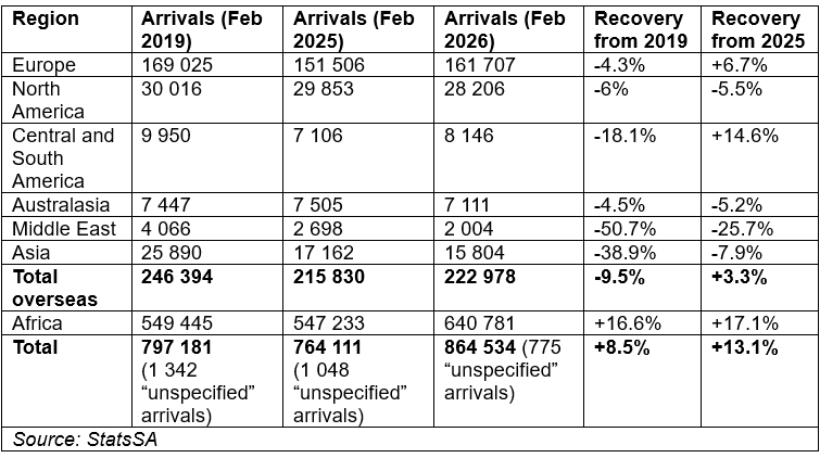 According to the latest International Tourism Report from Statistics South Africa (StatsSA), total arrivals reached 864 534 in February 2026 – a 13.1% increase on February 2025 and 8.5% higher than February 2019.