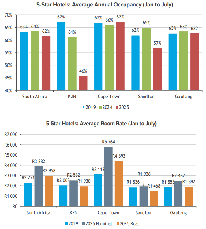 BDO’s Tourism Trends Report highlights that average room occupancy (ARO) at five-star hotels in KwaZulu-Natal plummeted to 46% in the first seven months of 2025 – from 61% in 2024 and 67% in pre-COVID 2019. In Sandton, occupancies fell to 57% from 65% in 2024 and 62% in 2019.