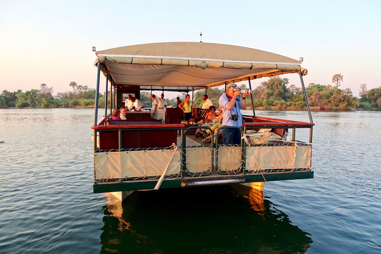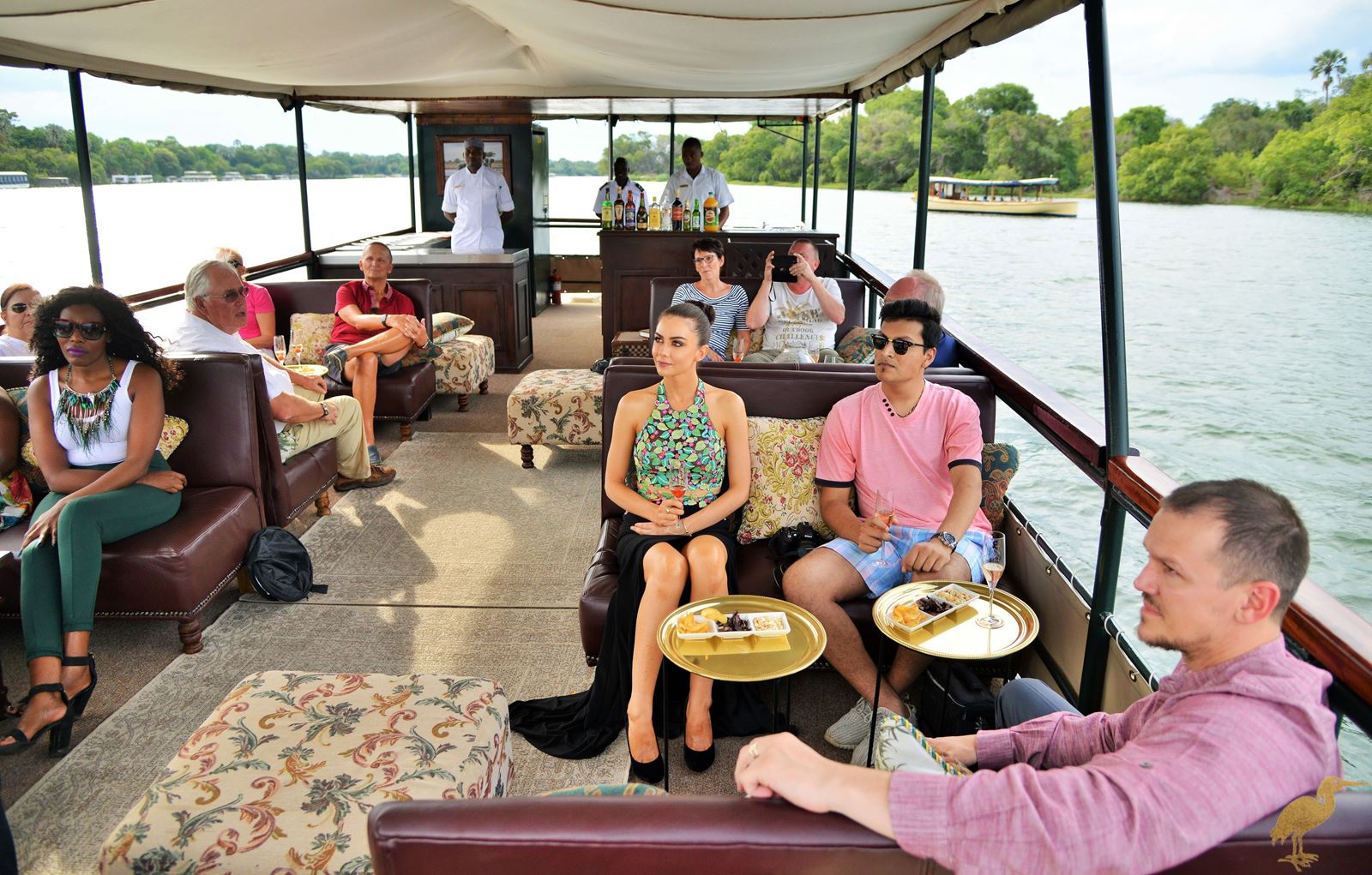 Climb aboard the Premium River Safari boat, The Victoria, for a delightful afternoon on the Zambezi River, exploring the pattern of islands right above the Victoria Falls.