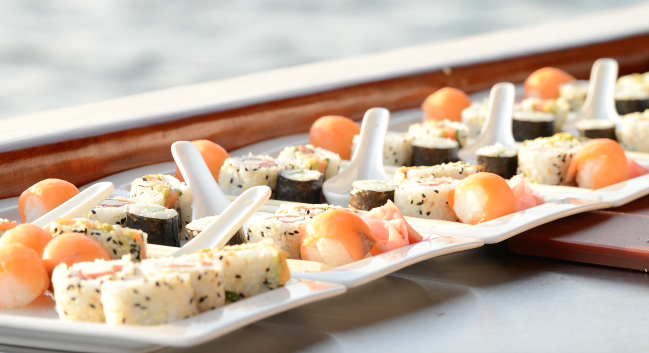 Snack on fresh sushi prepared on the boat by a professional chef, along with a refreshing beverage, while drifting down the Zambezi River.