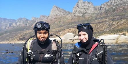Ezemvelo KZN Wildlife Scientist, Tembisa Jordaan, and WILDOCEANS Executive Director, Dr Jean Harris, pictured in Duiker Island, Hout Bay, before a research dive that was filmed as part of Our Oceans film Sharks Episode. Credits:  WILDOCEANS.