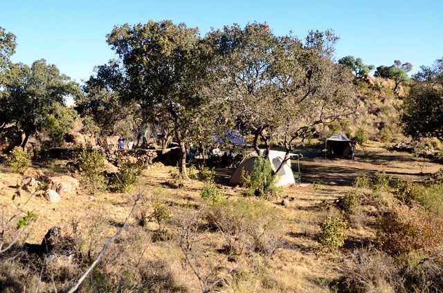 One is a safari tented camp, where wildebeest like to graze, near the restored heritage home of one of the early gold-mining magnates under a grove of white stinkwood trees. The other is a fly-camp, four tents sheltered in a grove of trees, on the crest of a koppie with a view past the Hartbeeshoek satellite station to the Hartbeespoort Dam region of the Magaliesberg hills.