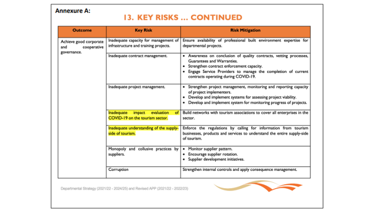 The presentation (slide 22) confirmed that one of the risks for the NDT was inadequate impact evaluation of COVID-19 on the tourism sector, and inadequate understanding of the supply-side of tourism (see Annexure A). Slide 5 of the presentation (Annexure B) graphically presented the NDT’s Local First Recovery Plan.