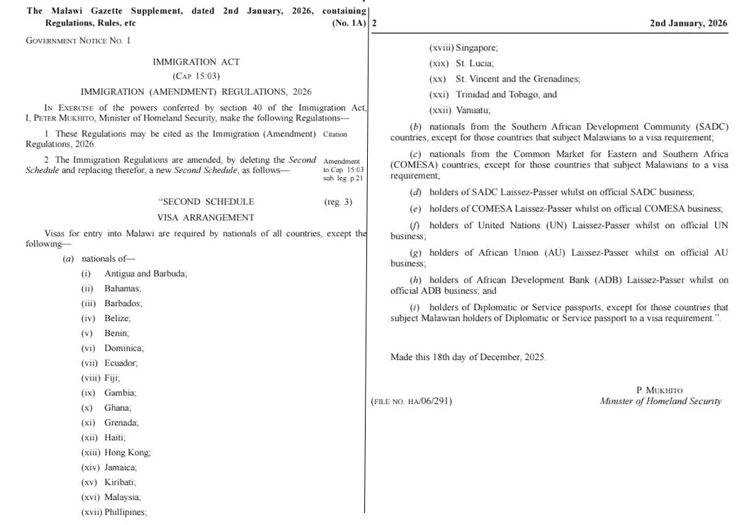 The policy, which requires travellers from all countries that subject Malawians to visa requirements to apply for an e-visa, was officially gazetted by Minister of Homeland Security Peter Mukhito on January 2. The list of countries includes all of Malawi’s top overseas tourism source markets.