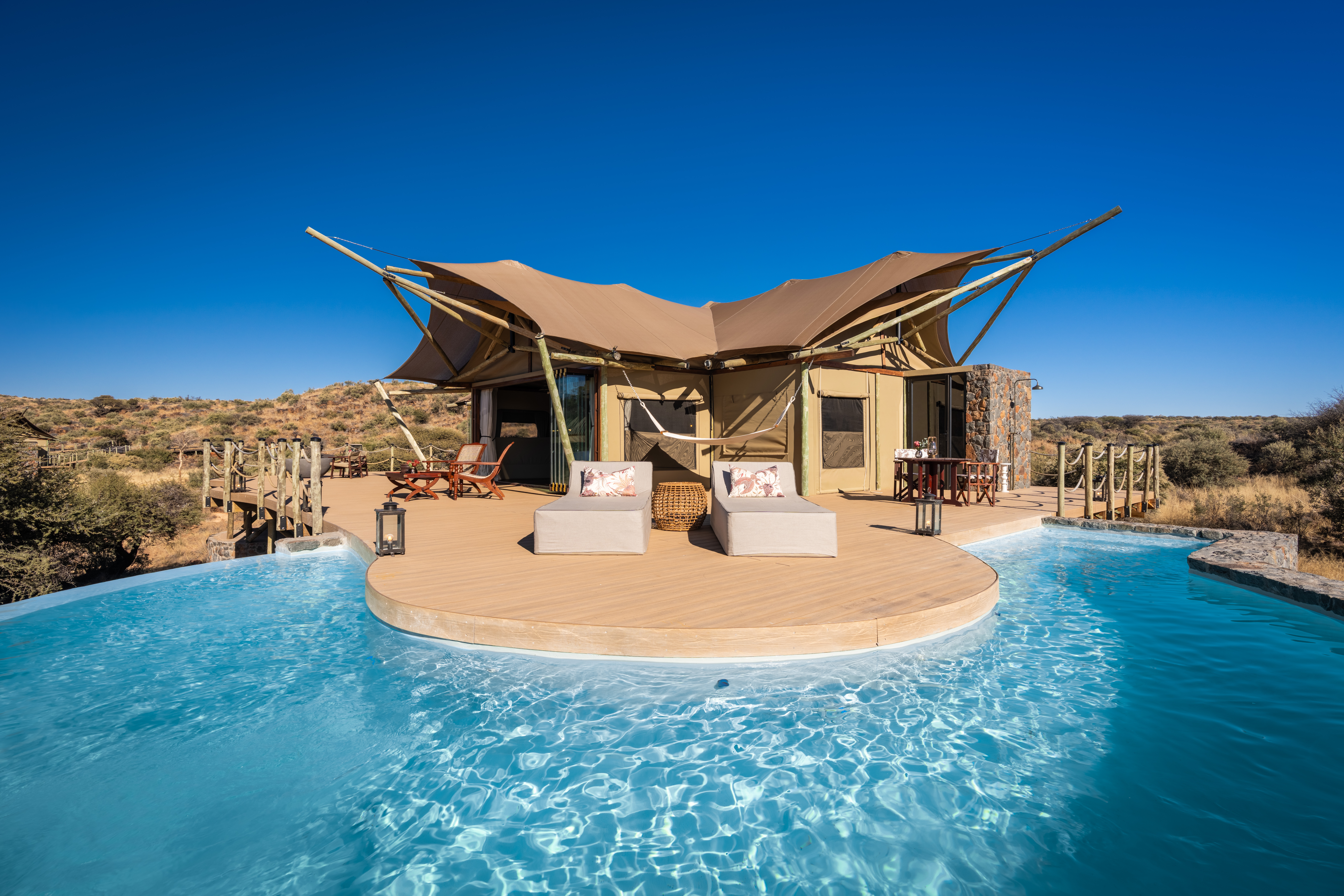 The four Maloba suites each feature a private plunge pool, indoor and outdoor showers, a fireplace and bush-facing decks. The Diamond Suite includes an expanded pool, a private firepit, panoramic views of the Didimala thornveld and a private safari vehicle.