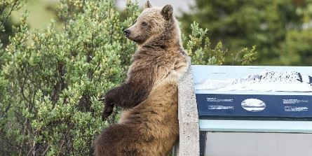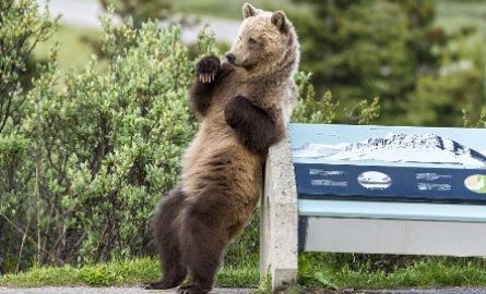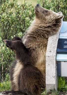 A huge grizzly bear was spotted performing a bizarre back scratching dance as it tried to alleviate an unbearable itch.