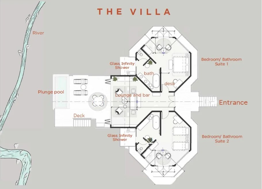 Each villa includes a private deck and plunge pool, spacious bedrooms with freestanding baths and indoor/outdoor showers. One of the villas is fully equipped for guests with mobility challenges, offering lift access and direct level pathways to all areas.