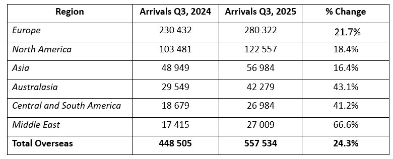 Between July and September, overseas arrivals surged by 24% in comparison to the third quarter of 2024, according to the latest International Tourism Report from Statistics South Africa. The largest source market regions of Europe (280 322 arrivals) and North America (122 557 arrivals) grew by 21.7% and 18.4% respectively.