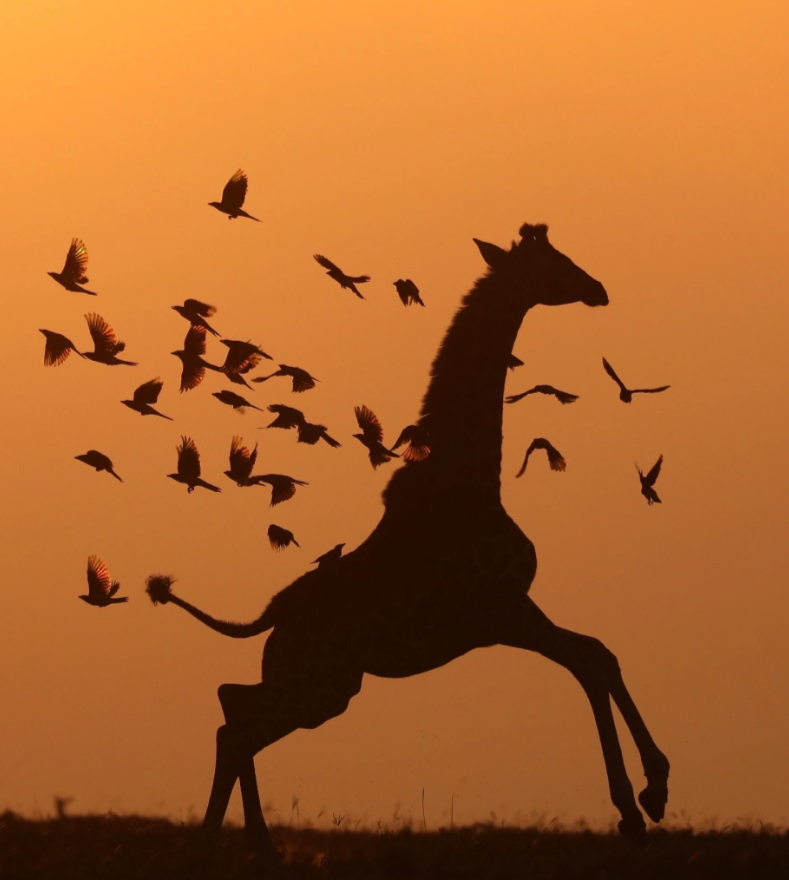 ‘Giraffe on Sunset’ shows James Kaani Nampaso’s image of a giraffe’s journey along the horizon at Kicheche Bush Camp in Kenya.