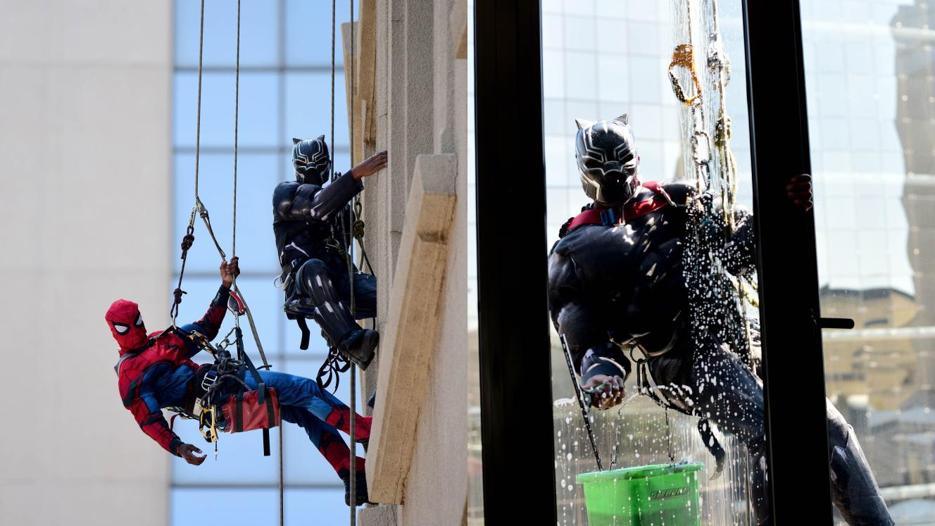 A team of Marvel superheroes were spotted dangling off the side of the DAVINCI Hotel & Suites in Sandton on Monday. Spiderman, Black Panther, Batman and Superman were in fact the hotel’s window-cleaning crew prepping for a wash and clean of the building’s exterior.