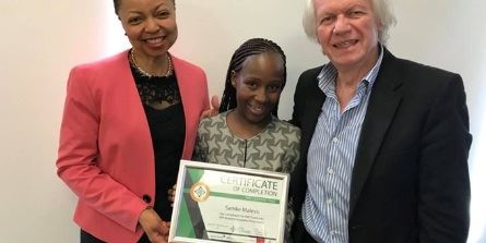GM of the Soweto Hotel, Samke Malevu (centre), receiving her Certificate of Completion from Lindiwe Sangweni-Siddo (left), Owner of the Soweto Hotel, guest speaker of the ceremony, Deputy Chair of the Tourism B-BBEE Charter Council and Director of Operations at City Lodge Hotels Group; with Rod Cusens, SME TradeLinks Incubator Resident Expertaption