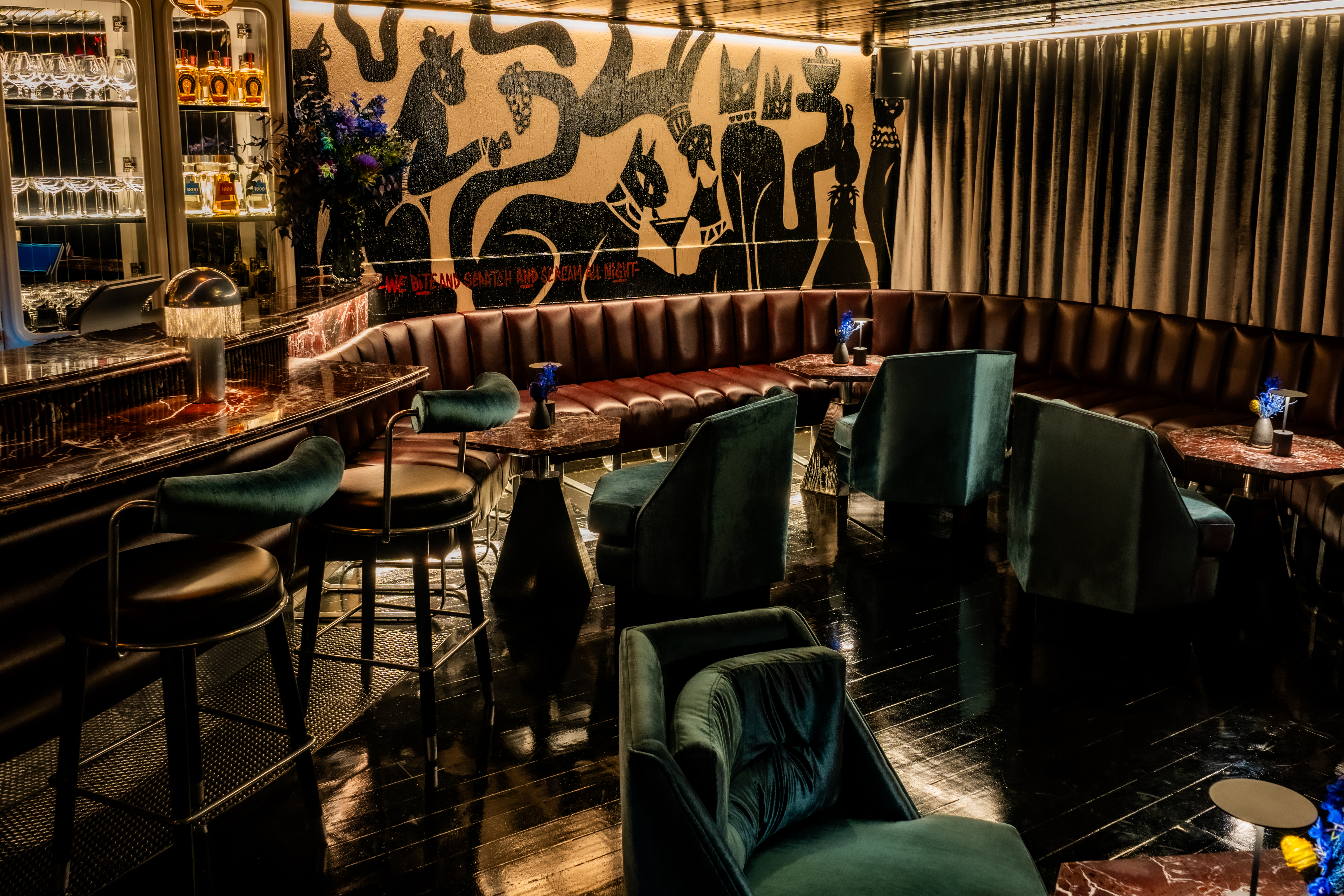 The venue draws on a 1970s-inspired design and combines a cocktail-led bar with a compact dining offering. It operates as an after-hours space aimed at hotel guests and local residents.