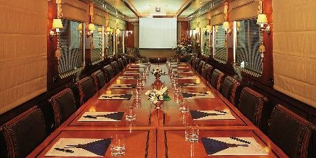 The new Observation Car can also be converted into a conference room for business meetings and events. For this, high-back leather padded chairs with The Blue Train insignia carved on the top of the back wooden frame, along with high-gloss solid birch-wood tables are made available. This conference set up is complete with plug points, audio-visual set up, that includes a projector and screen.