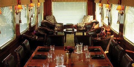 As is commensurate with The Blue Train, the interior of the Observation Car is tastefully designed, continuing the genius of interior designers at Wilson & Associates. It is classic, sophisticated and luxurious without compromising functionality, featuring muted gold tones and rich blue hues. The fixtures include polished, solid birch-wood panelling with wide double-glazed window panels that offer clear multidirectional views of the landscape. Two plush wingback chairs are placed at the tail end of the train to comfortably ensconce the guests as they take in the view. In the middle of the car, on either side are three intimate seating coves of short leatherback tub chairs coupled with high-gloss solid wood tea tables. At the entrance, just before the automated birch solid-wood door with laser printed glass, are six four-chair settings with tables, perfect for small-group seating over a light gourmet meal or fine beverage.
