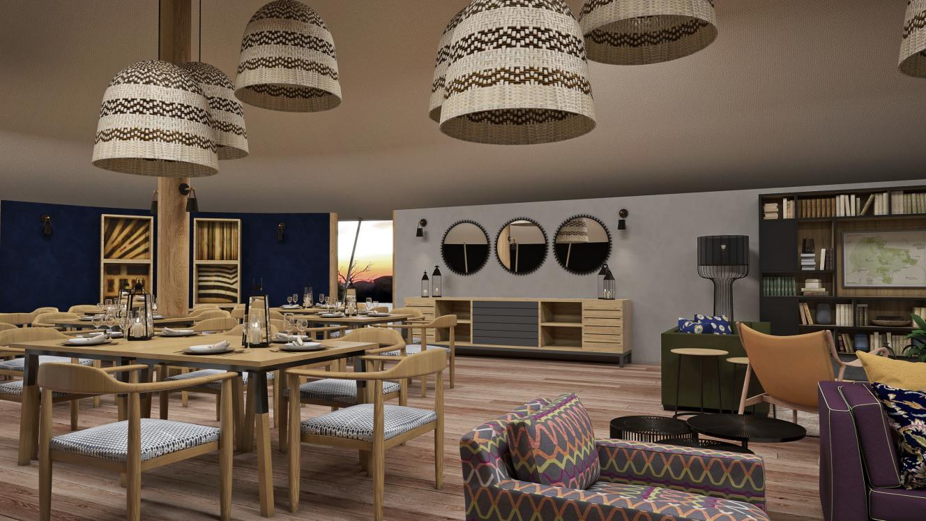 Inside the spacious and beautifully appointed main tent, inviting sofas and chairs encourage guests to linger. The camp’s colours are inspired by nature, from ‘sun-bleached’ wood and wicker lampshades to intense bursts of colour in the exuberant fabrics, like wildflowers dotted around the landscape. The tented ceiling and soft lighting create a sophisticated ambience. The lounge looks out on to the boma, where guests can gather to hear thrilling tales and local legends shared by the camp’s safari guides.