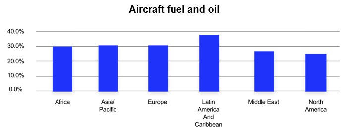 For instance, in Latin America and the Caribbean, aircraft fuel forms 36.3% of total airline costs, compared with 25.5% in North America.