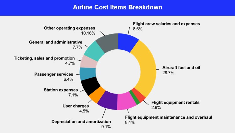 Aircraft fuel and oil account for a substantial 28.7% of total airline costs, highlighting the significant impact of fuel prices on operational expenses.