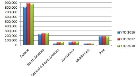 Continuing from June’s poor performance, the European market has also shown a decline, delivering 876 884 arrivals so far in 2018, 2% down from last year. Arrivals from key markets are consistent with the overall year trend, generally showing declines across the board: