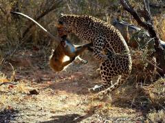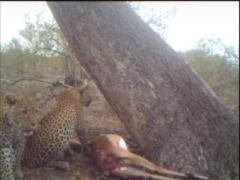 Leopard and cub with kill at Umkumbe, Sabi Sands